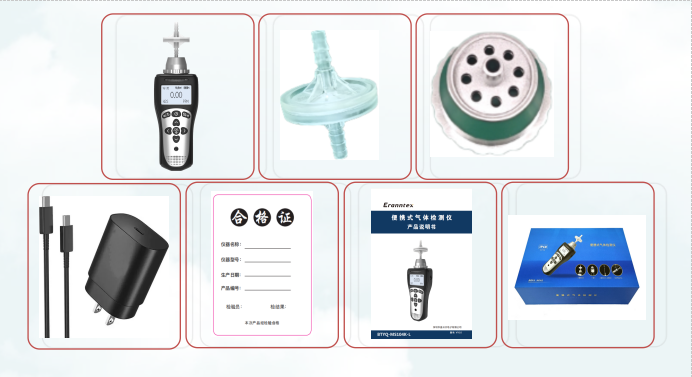 BTYQ-MS104K-L型氣體檢測儀主機1臺、泵吸式過濾嘴1個、標定罩1個、充電器(含充電線)1套、合格證/保修卡1張、說明書1本、儀器包裝盒1個。