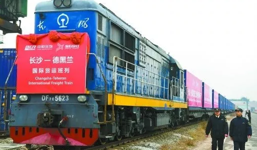 12月28日,中歐班列長(zhǎng)沙至德黑蘭首發(fā)。15時(shí)26分,滿載著日用品、服裝、家用電器等物品的51個(gè)集裝箱班列,從長(zhǎng)沙北鐵路口岸國(guó)際貨場(chǎng)啟程。 ...