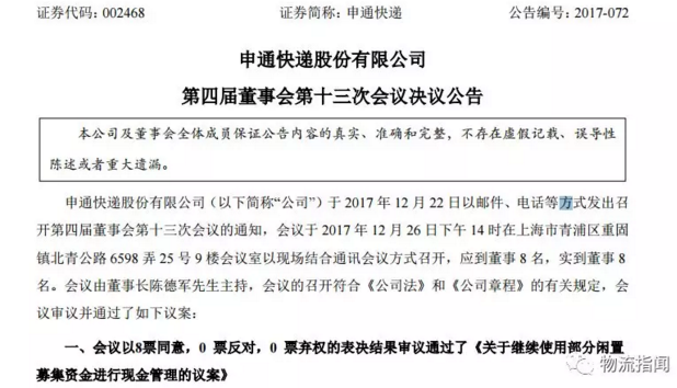 根據(jù)申通最新公告,12月26日,申通快遞第四屆董事會第十三次會議審議通過《關(guān)于使用自有資金進(jìn)行投資理財?shù)淖h案》,同意公司及其子公司使用...