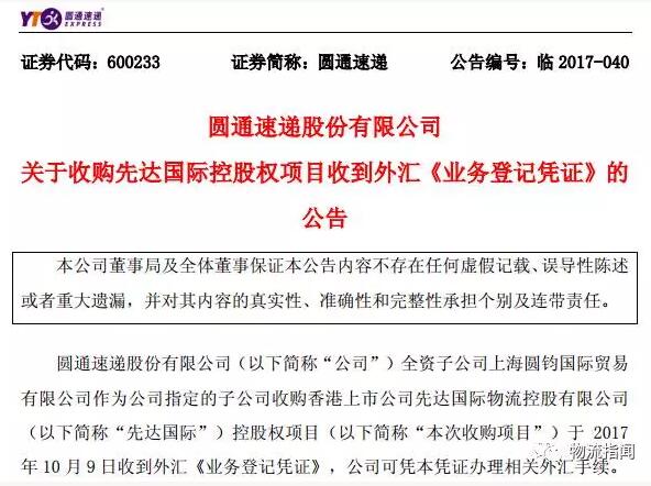 圓通速遞9日晚發(fā)布公告稱全資子公司上海圓鈞國際貿(mào)易有限公司作為公司指定的子公司收購香港上市公司先達(dá)國際物流控股有限公司控股權(quán)項(xiàng)目于2...