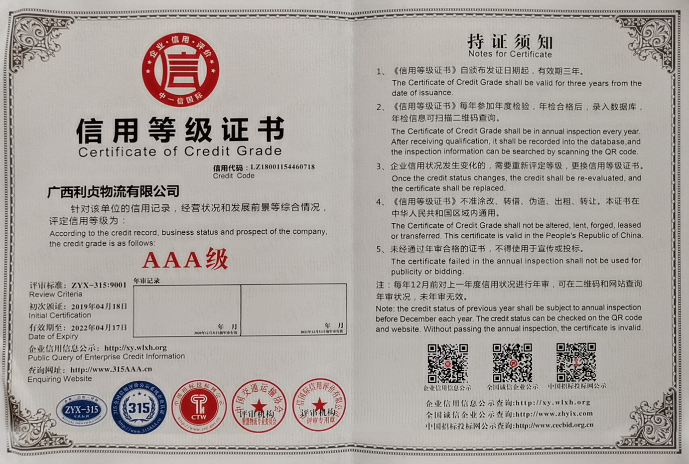 3A級(jí)信用等級(jí)證書(shū)