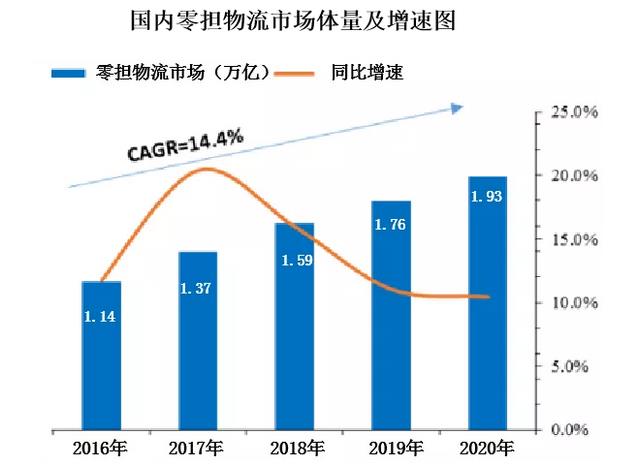 專家預(yù)測(cè),到2020年,零擔(dān)物流(即專線物流)行業(yè)市場(chǎng)體量將達(dá)到近2萬億元。從2016年開始,整個(gè)市場(chǎng)都在以10%以上的速度在增長(zhǎng),發(fā)展前景十分廣闊。
