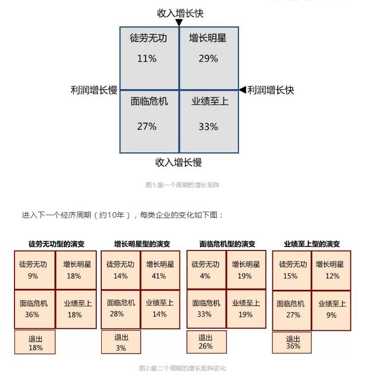 毋庸置疑,跨越兩個經濟周期,表現(xiàn)最好的是「增長明星」。這類既關注收入增長,又關注利潤回報的企業(yè),持續(xù)領先的概率大;而那種戰(zhàn)略保守,控制收入增長速度,僅重視利潤的「業(yè)績至上」的企業(yè),退出市場的比例最高,整體表現(xiàn)甚至不如「面臨危機」的企業(yè)(絕處逢生,反而轉型成功)。