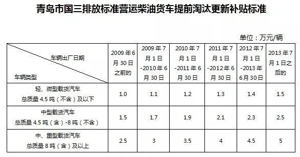 補(bǔ)貼對象:市南區(qū)、市北區(qū)、李滄區(qū)、嶗山區(qū)、城陽區(qū)(含青島高新區(qū))、西海岸新區(qū)注冊登記營運(yùn)手續(xù)的國三排放標(biāo)準(zhǔn)營運(yùn)柴油貨車,
