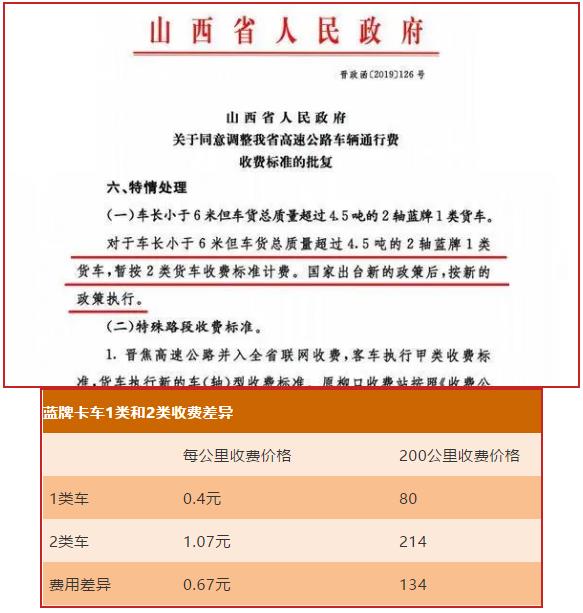 年初,山西省人民政府發(fā)布《關(guān)于同意調(diào)整我省高速公路車(chē)輛通行費(fèi)收費(fèi)標(biāo)準(zhǔn)的回復(fù)》晉政函【2019】126號(hào)通知。其中,第六條特情處理指出:“車(chē)長(zhǎng)小于6米但車(chē)貨總質(zhì)量超過(guò)4.5噸的2軸藍(lán)牌1類(lèi)貨車(chē),暫按2類(lèi)貨車(chē)收費(fèi)標(biāo)準(zhǔn)計(jì)費(fèi)。國(guó)家出臺(tái)新的政策后,按新的政策執(zhí)行”。
