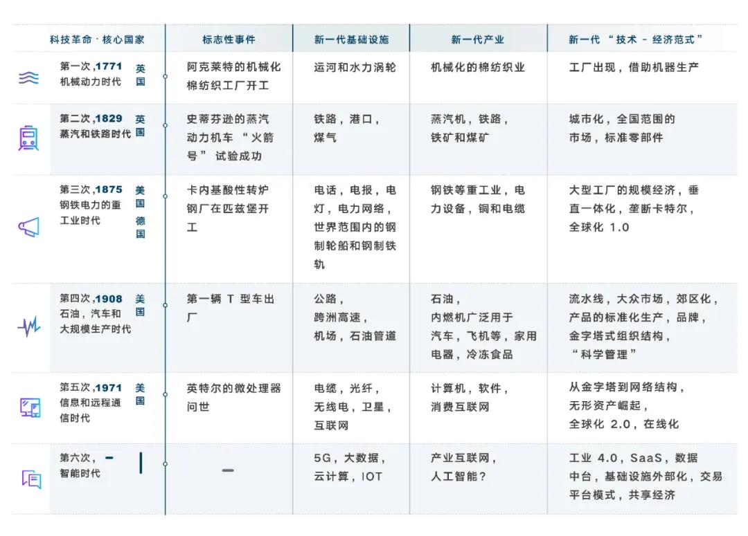 2003 年,英國(guó)劍橋大學(xué)的著名學(xué)者卡洛塔·佩雷斯在其著作《技術(shù)革命與金融資本》中將過(guò)去兩百多年工業(yè)革命的歷史進(jìn)程分為五個(gè)階段,而當(dāng)前我們即將進(jìn)入第六個(gè)階段: