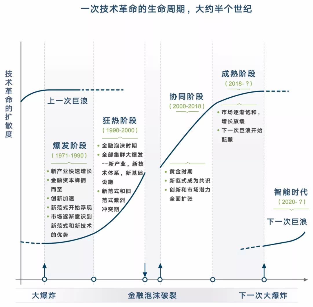 上圖是以第五次科技革命為案例所展示的科技生命周期。周期大約持續(xù)了半個(gè)世紀(jì),我們已經(jīng)依次經(jīng)歷了爆發(fā)階段(新產(chǎn)業(yè)爆發(fā)式增長(zhǎng),金融資本蜂擁而至),狂熱階段(全部集群大爆發(fā),金融泡沫從狂熱走向破裂),協(xié)同階段(新范式成為共識(shí),新技術(shù)應(yīng)用的黃金時(shí)期),成熟階段(市場(chǎng)增速明顯放緩,進(jìn)入存量博弈)。