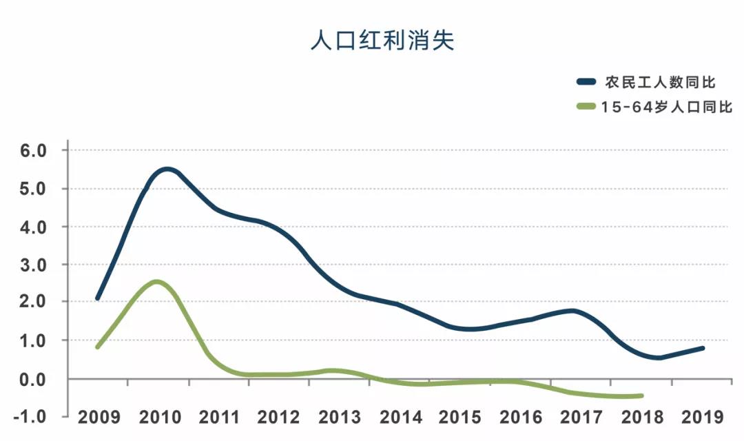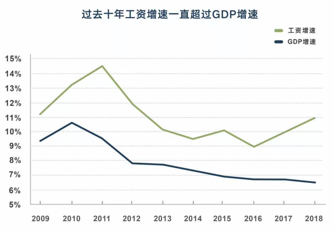 事實(shí)上,目前中國(guó)不僅面臨千載難逢的新一代科技革命帶來(lái)的歷史機(jī)遇,還面對(duì)著原有增長(zhǎng)模式不可持續(xù)的嚴(yán)峻挑戰(zhàn),其中最重要的當(dāng)屬“未富先老”,人口紅利的消失。如下圖,過(guò)去十年中國(guó)的工資增速一直超過(guò) GDP 增速,制造業(yè)低成本的優(yōu)勢(shì)逐漸喪失,企業(yè)對(duì)于效率提升的需求已經(jīng)到了刻不容緩的地步。
