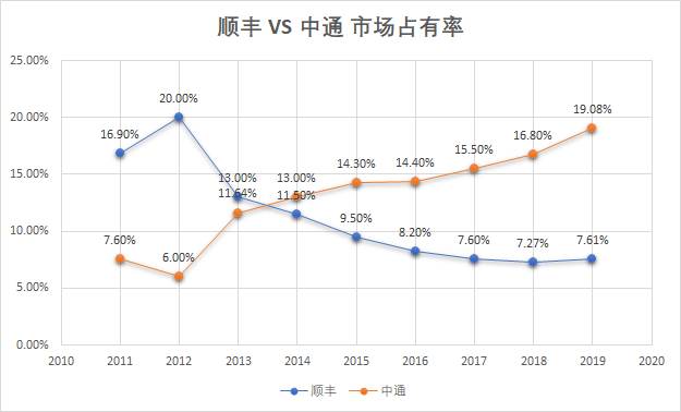 據(jù)公開(kāi)數(shù)據(jù)顯示,2012年的民營(yíng)快遞業(yè)老大順豐市場(chǎng)占有率為20%,而中通市場(chǎng)占有率為6%。但是此后,中通和順豐在快遞業(yè)井噴的洪流中走出了兩條截然不同的曲線,位置相互顛倒。