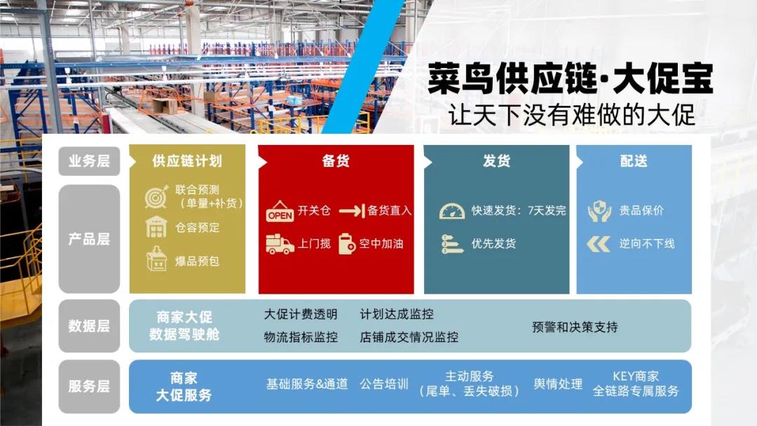 在這樣的產(chǎn)品框架下,菜鳥供應(yīng)鏈推出了一批“寶寶軍團”,從分倉到銷量預(yù)測、數(shù)據(jù)可視化,從大促物流到全鏈路托管,從渠道到供應(yīng)鏈金融,阿里在物流供應(yīng)鏈領(lǐng)域沉淀下來的能力,正被產(chǎn)品化并向商家輸出,而名字里的各種“寶”,也有一種“淘寶”、“支付寶”的熟悉味道。