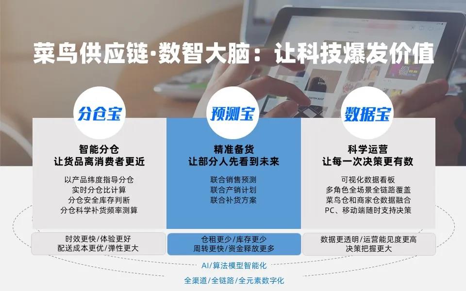 其中,特別重磅推出的菜鳥供應(yīng)鏈數(shù)智大腦,通過數(shù)智化分倉、數(shù)智化預(yù)測、數(shù)智化決策等產(chǎn)品組合,助力商家通過數(shù)智化技術(shù)驅(qū)動供應(yīng)鏈升級,使之更高效、智能。