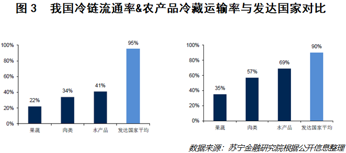 雖說我國冷鏈物流行業(yè)正在快速發(fā)展,但與發(fā)達國家相比,我國人均冷庫容量、冷鏈流通率以及農(nóng)產(chǎn)品冷藏運輸率等多項關鍵指標仍有顯著差距,冷鏈基礎設施不完備疊加生鮮產(chǎn)品自身保質(zhì)期短、易損壞等特點,使其在層層流轉(zhuǎn)中產(chǎn)生較高的損耗率,其中果蔬、肉類、水產(chǎn)品損耗率遠超發(fā)達國家平均水平(見圖3)。