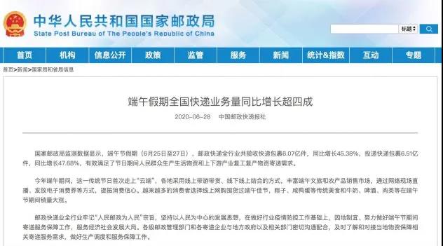 國(guó)家郵政局監(jiān)測(cè)數(shù)據(jù)顯示,端午節(jié)假期(6月25日至27日),郵政快遞全行業(yè)共攬收快遞包裹6.07億件,同比增長(zhǎng)45.38%,投遞快遞包裹6.51億件,同比增長(zhǎng)47.68%,有效滿足了節(jié)日期間人民群眾生產(chǎn)生活物資和上下游產(chǎn)業(yè)復(fù)工復(fù)產(chǎn)物資寄遞需求。