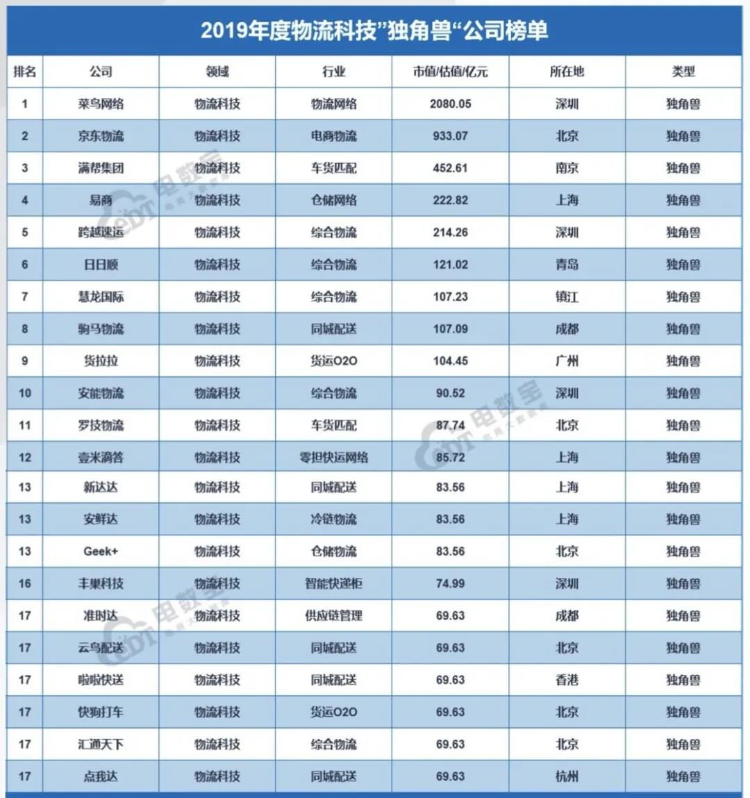 總體而言,《報(bào)告》顯示,2019年,物流科技共有22家“獨(dú)角獸”,同比增長(zhǎng)37.5%??偣乐颠_(dá)768.33億美元,同比增長(zhǎng)3.1%。菜鳥(niǎo)網(wǎng)絡(luò)(298.72億美元)、京東物流(134億美元)、滿幫集團(tuán)(65億美元)領(lǐng)銜前三位。