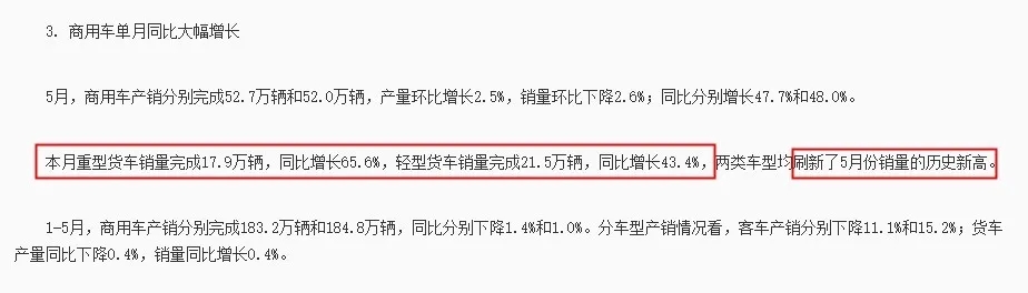 5月份重型貨車(chē)銷(xiāo)量完成17.9萬(wàn)輛,同比增長(zhǎng)65.6%,輕型貨車(chē)銷(xiāo)量完成21.5萬(wàn)輛,同比增長(zhǎng)43.4%,兩類(lèi)車(chē)型均刷新了5月份銷(xiāo)量的歷史新高。