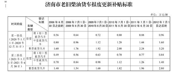 本補貼政策實施時間為2020年1月1日至2021年6月30日,分兩個時段實施,第一時段為2020年1月1日至12月31日,第二時段為2021年1月1日至6月30日。對提前報廢的柴油貨車給予0.49~3.20萬元不等的資金補貼。