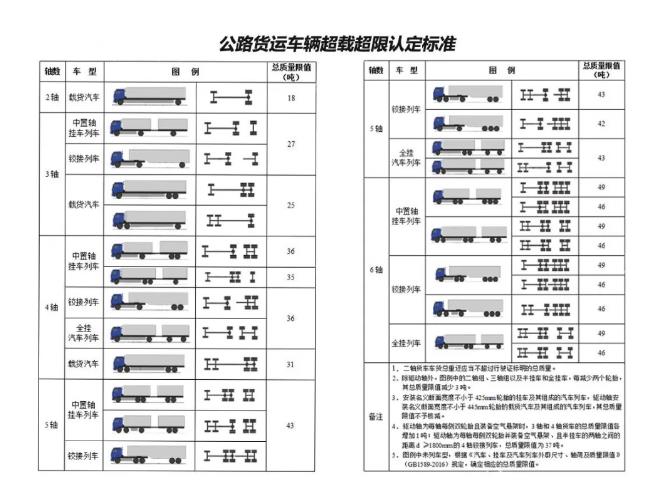 對(duì)于超載的認(rèn)定標(biāo)準(zhǔn),將貨車按照2至6軸分為4個(gè)大類。超載質(zhì)量均以貨車總質(zhì)量來限制,總質(zhì)量是整備質(zhì)量+核定載質(zhì)量+乘員質(zhì)量,也就是車重、貨重和人重的總和,行駛本上都有登記。