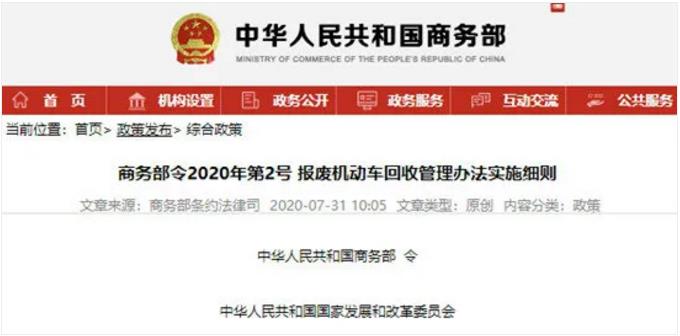 7月31日,商務(wù)部正式公布《報(bào)廢機(jī)動(dòng)車回收管理辦法實(shí)施細(xì)則》,該《細(xì)則》將于2020年9月1日起施行?!都?xì)則》提出,禁止任何單位或者個(gè)人利用報(bào)廢機(jī)動(dòng)車“五大總成”拼裝機(jī)動(dòng)車,機(jī)動(dòng)車維修經(jīng)營(yíng)者不得承修已報(bào)廢的機(jī)動(dòng)車。