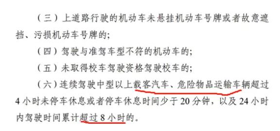 這其中我們可看到,連續(xù)駕駛中型以上載客汽車、危險(xiǎn)物品運(yùn)輸車輛超過4小時(shí)未停車休息或者停車休息時(shí)間少于20分鐘,以及24小時(shí)內(nèi)駕駛時(shí)間累計(jì)超過8小時(shí)的,一次記9分。