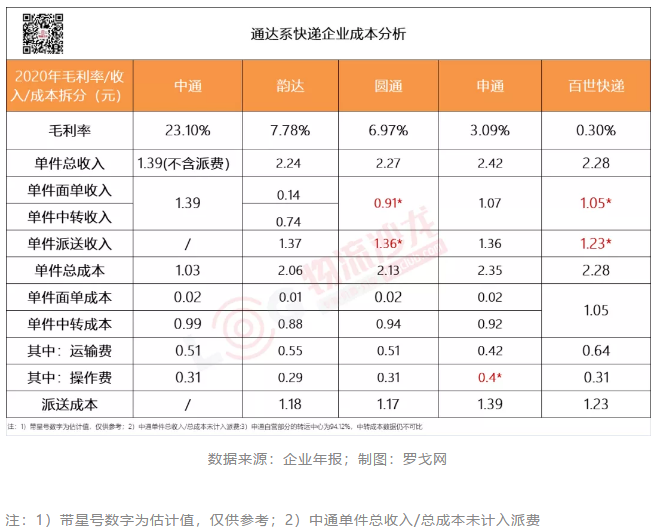 目前,通達(dá)系目前總部給到加盟網(wǎng)點(diǎn)基本在1元/票左右的派件費(fèi),這其中首先支付承包區(qū)(或快遞員)派件費(fèi)80%左右,剩余20%左右的收入還要支付辦公及中轉(zhuǎn)場(chǎng)地租金、司機(jī)、客服等運(yùn)營成本,如果單量不高,其實(shí)大部分網(wǎng)點(diǎn)都不賺錢或只有微利。
