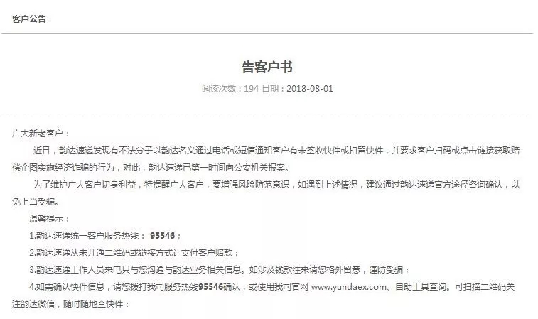 8月1日,韻達速遞發(fā)布《告客戶書》,稱近日發(fā)現有不法分子以韻達名義通過電話或短信通知客戶有未簽收快件或扣留快件,并要求客戶掃碼或點擊鏈接獲取賠償企圖實施經濟詐騙的行為,并表示,韻達速遞已第一時間向公安機關報案。